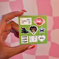 Each zine includes a jumbo sticker of the zine's cover art and a 3x3 mini sticker sheet.